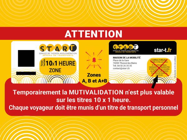 Les tickets 10 voyages ne sont plus multivalidables ! Publié le 17/12/2025 Infos réseau En raison d’un problème technique, la multivalidation des titres 10 x 1 heure n’est plus possible (zones : A, B et A+B). Chaque voyageur doit être munis d'un titre de transport personnel.
