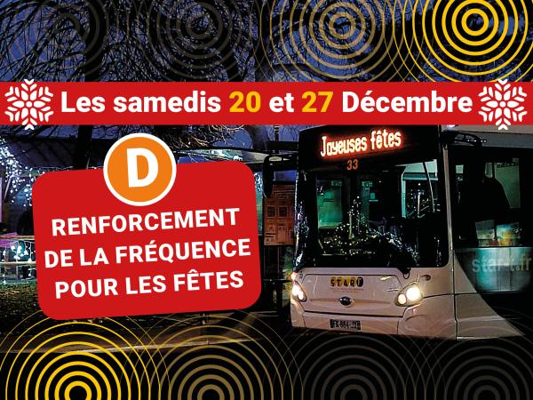 Renforcement de la fréquence Ligne D pour les Fêtes Publié le 15/12/2025 Infos réseau Des renforcements d'horaires seront réalisés sur la Ligne D les samedis 20 et 27 décembre 2025 les après-midi et début de soirée.