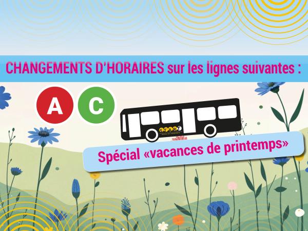 Vacances scolaires printemps 2026 Publié le 07/04/2026 Infos réseau Du 6 avril au 19 avril 2026, les lignes A et C fonctionneront en horaires de vacances scolaires. Pensez à anticiper vos déplacements en consultant notre rubrique : lignes et horaires.